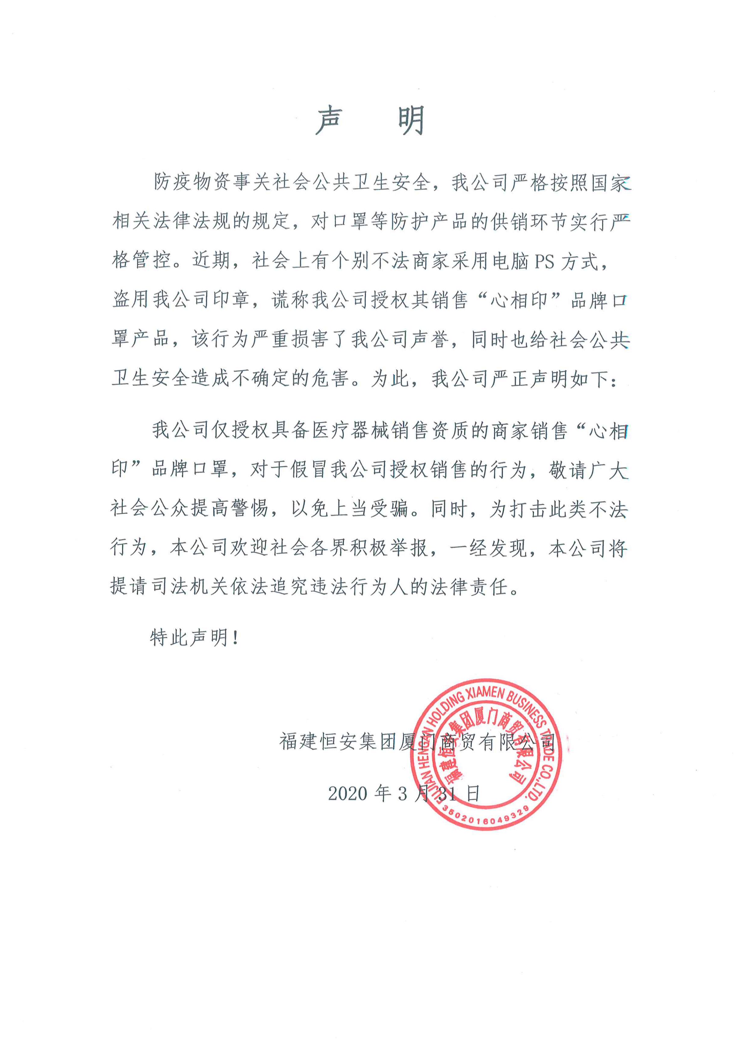 我公司仅授权具备医疗器械销售资质的商家销售“心相印”品牌口罩,对于假冒我公司授权销售的行为,敬请广大社会公众提高警惕,以免上当受骗。同时,为打击此类不法行为,本公司欢迎社会各界积极举报,一经发现,本公司将提请司法机关依法追究违法行为人的法律责任。