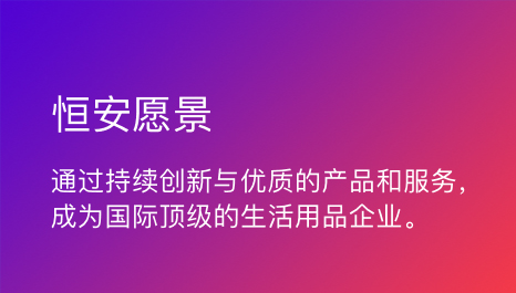 恒安坚持“诚信、拼搏、创新、奉献”的精神,以“追求健康,你我一起成长”为使命,通过持续的创新与优质产品服务,致力成为国际顶级的家庭生活用品企业。