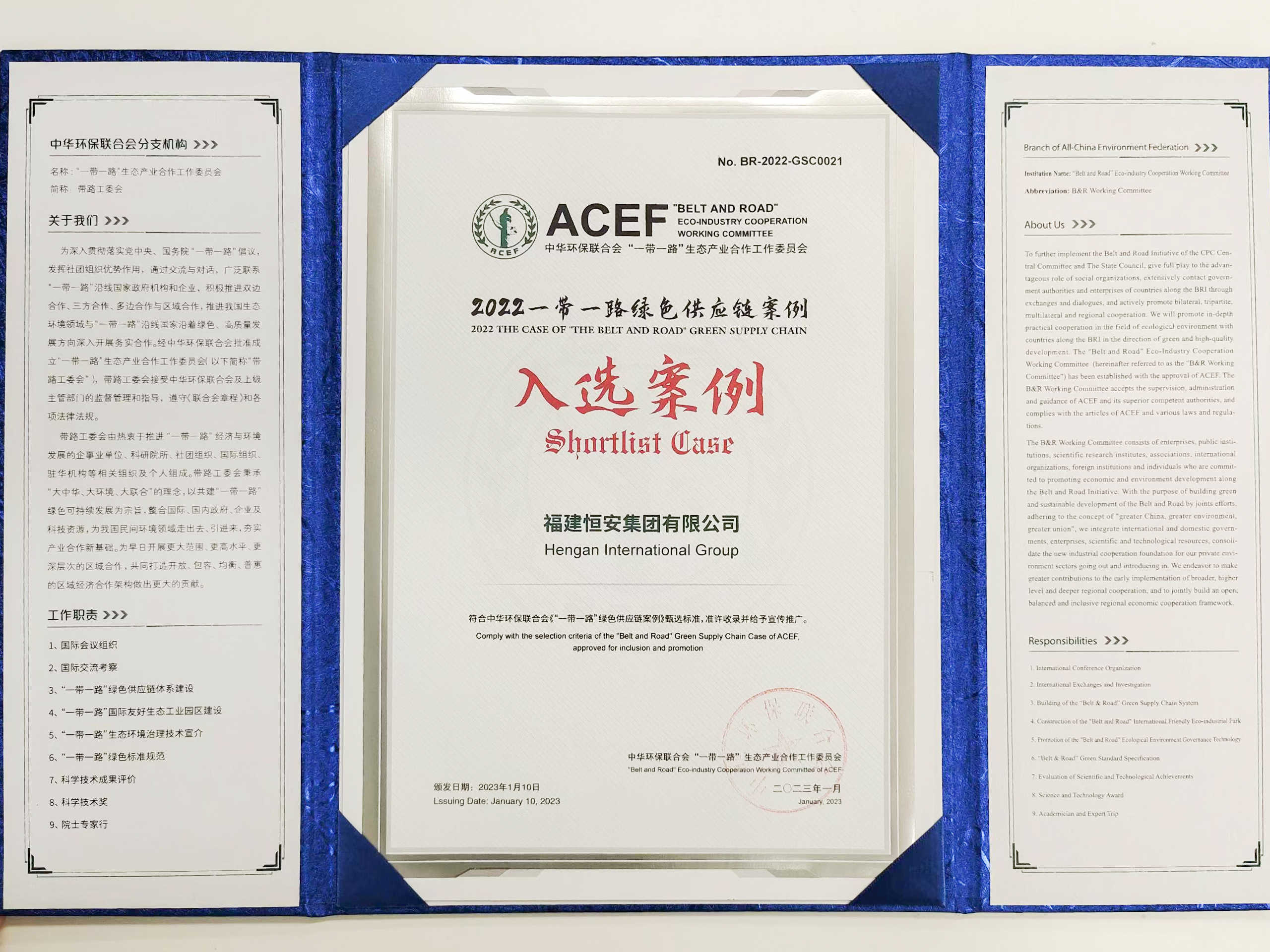 集团先后荣膺第十届世界环保(经济与环境)大会(WEC)“国际碳金奖”,第十一届WEC“唯一推荐产品”,成为全球企业践行可持续发展的典范模式。2021年底,工业和信息化部公布2021年度绿色制造名单中,福建恒安家庭生活用品有限公司成功入选2021年度国家级绿色工厂,这也是继恒安(芜湖)纸业有限公司之后,集团第二个国家级绿色工厂。